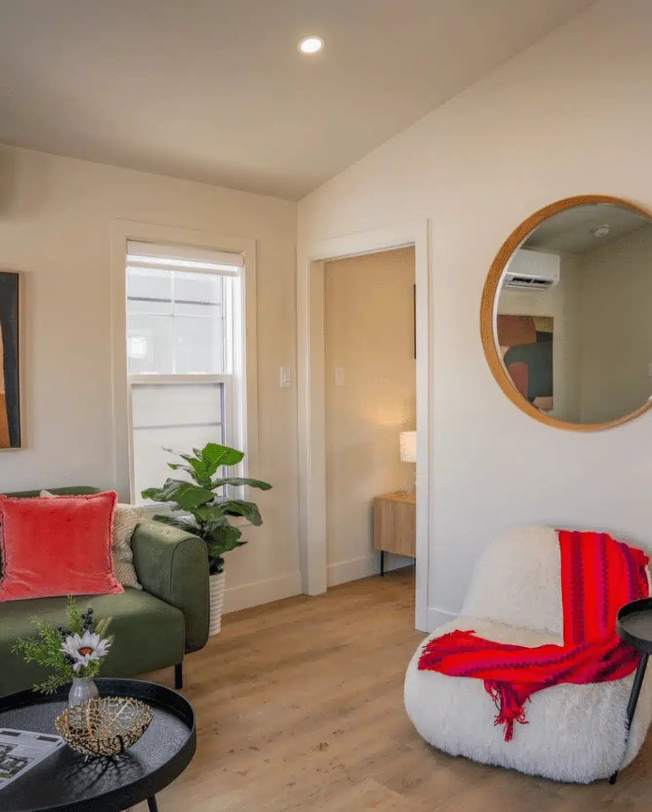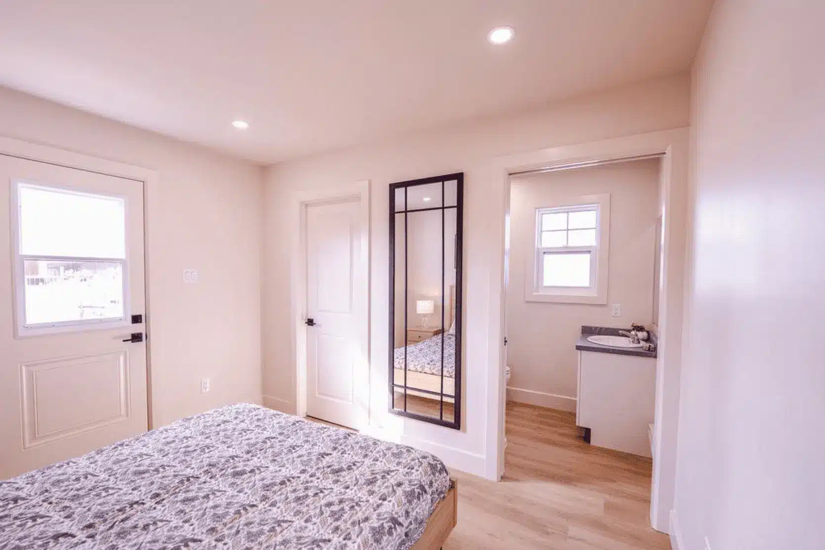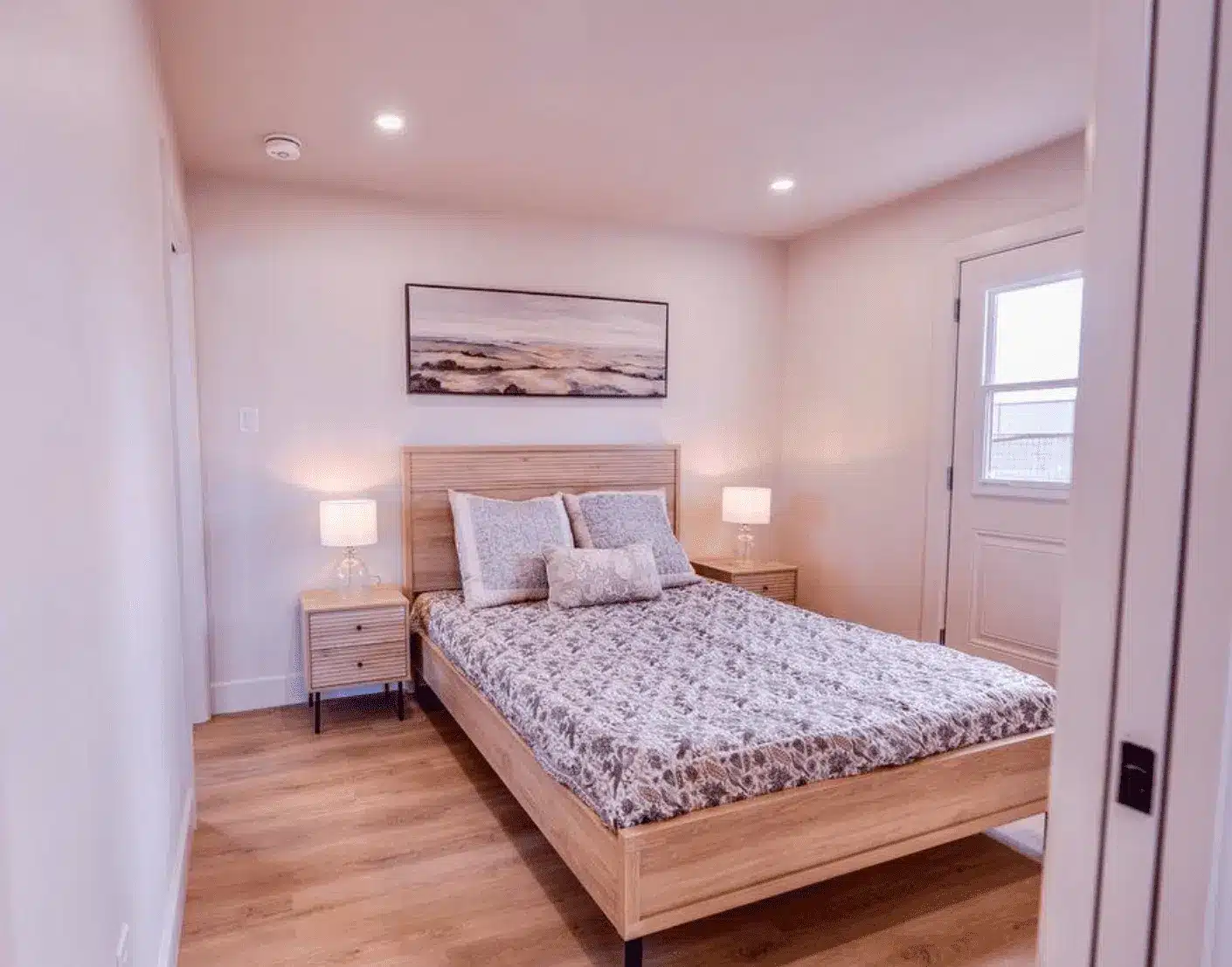 Two bedrooms with a full sized kitchen, laundry nook, deck, and linen storage. Designed for independent, single-floor living close to family.